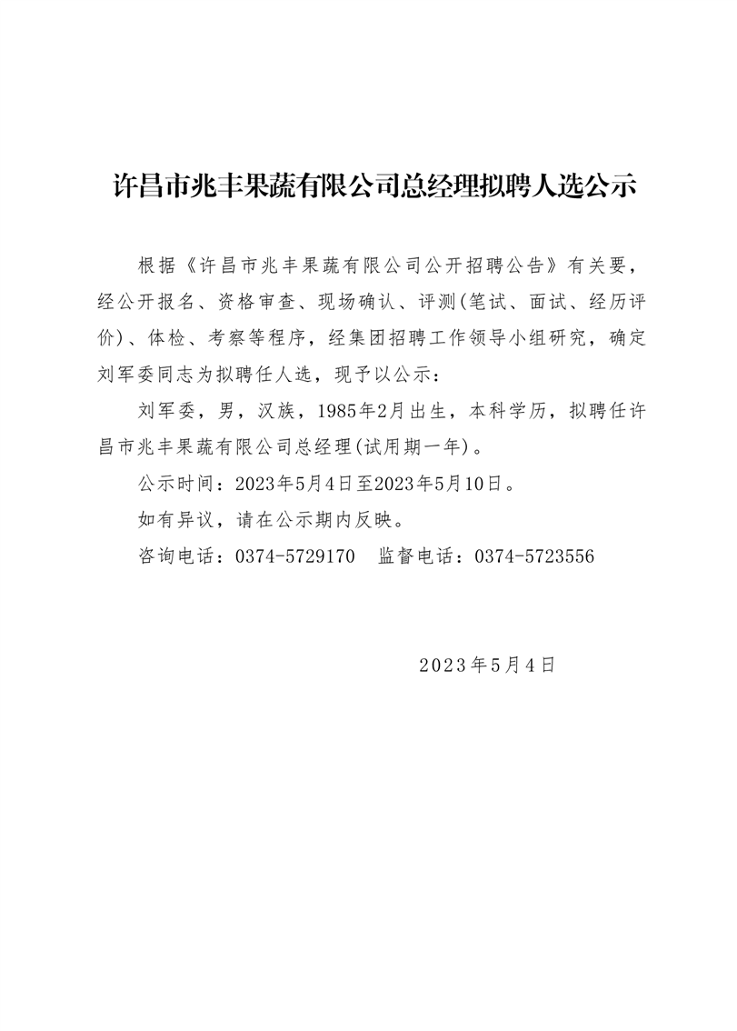 · 許昌市兆豐果蔬有限公司總經(jīng)理擬聘人選公示