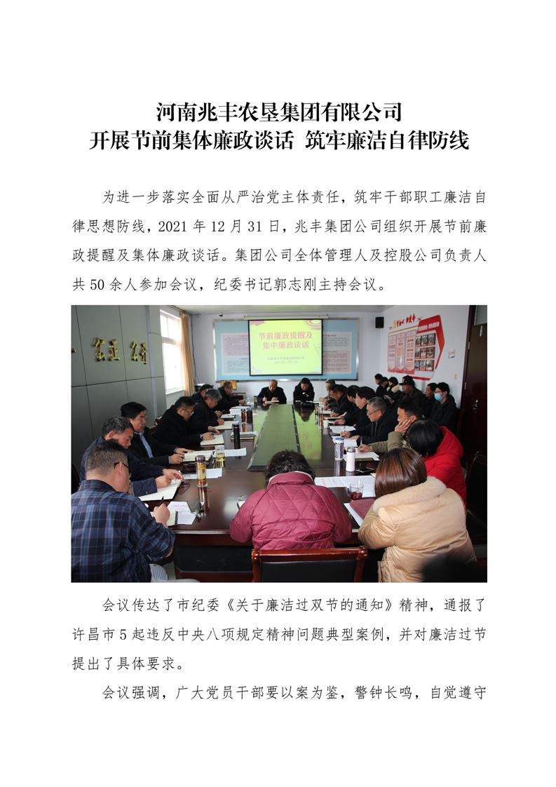 · 河南兆豐農(nóng)墾集團(tuán)有限公司 開展節(jié)前集體廉政談話 筑牢廉潔自律防線