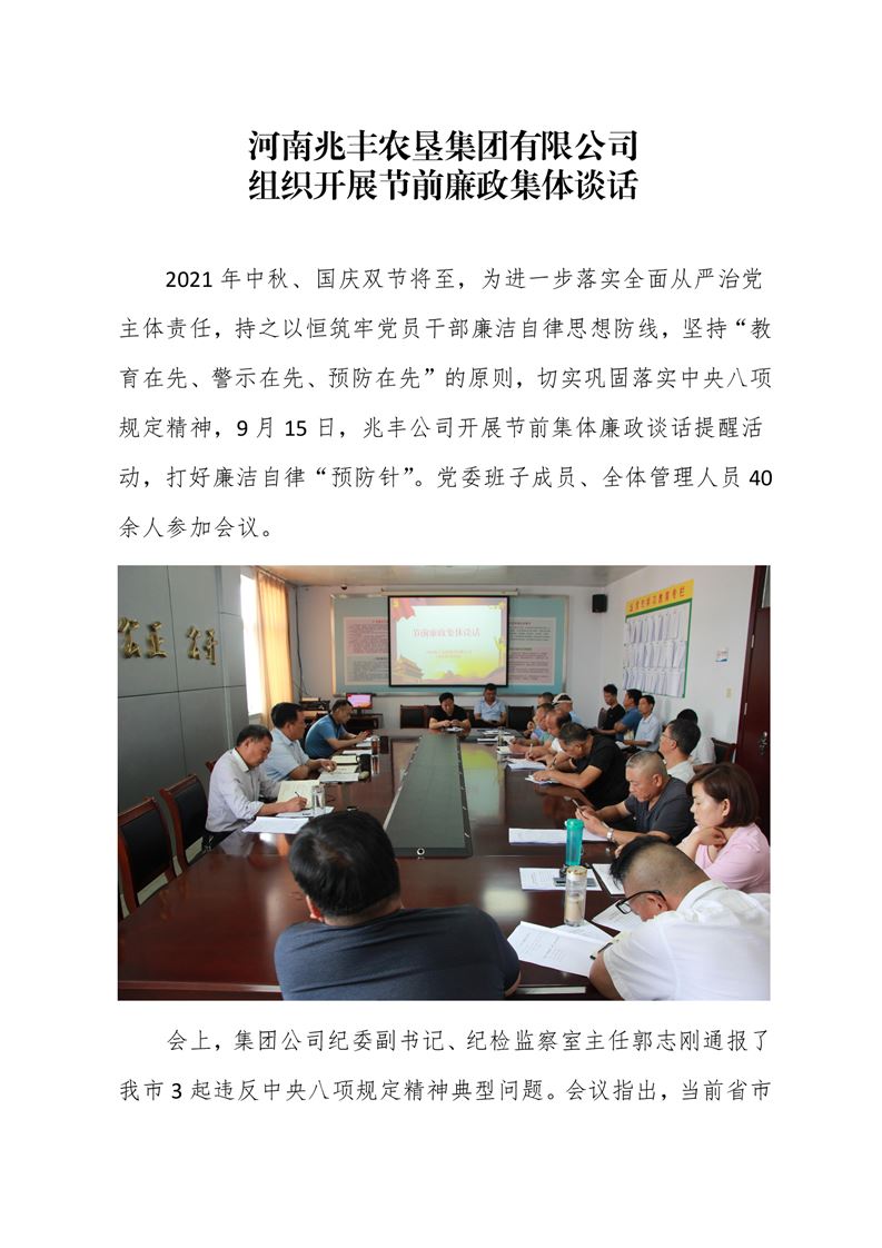 · 河南兆豐農(nóng)墾集團(tuán)有限公司 組織開展中秋、國(guó)慶節(jié)前廉政集體談話