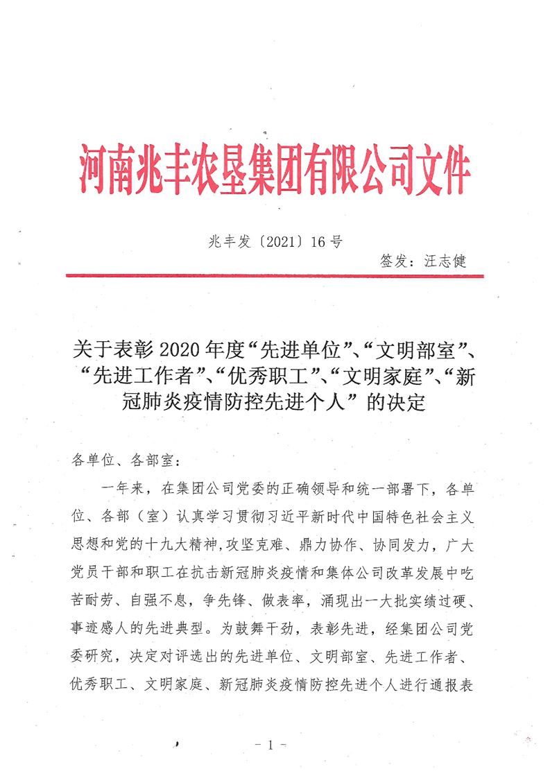 · 河南兆豐農(nóng)墾集團(tuán)有限公司 關(guān)于表彰2020年度“先進(jìn)單位”、文明部室”、“先進(jìn)工作者”、“優(yōu)秀職工”、“文明家庭”、新冠肺炎疫情防控先進(jìn)個(gè)人”的決定